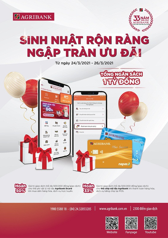 Để biết thêm thông tin chi tiết về các chương trình khuyến mại nhân dịp sinh nhật lần thứ 33 của Agribank, Qúy khách vui lòng liên hệ số điện thoại Trung tâm hỗ trợ và chăm sóc khách hàng: 1900558818/ (84)2432053205 hoặc tại website: agribank.com.vn, hoặc tại các điểm giao dịch của Agribank trên toàn quốc.