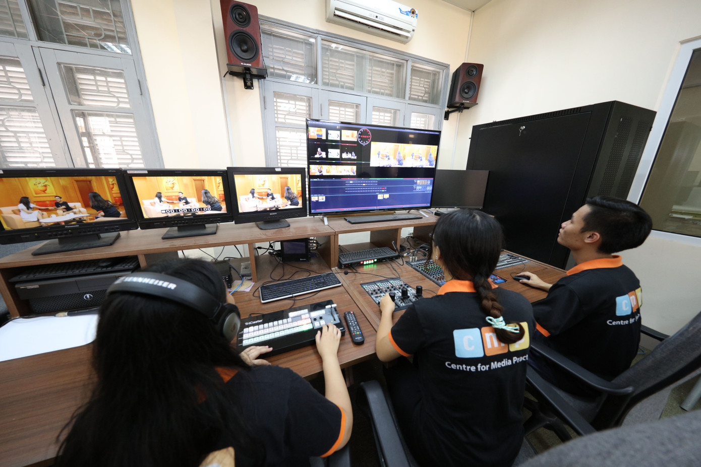 | Sinh viên ngành Báo chí, Viện Báo chí và Truyền thông, Trường ĐH Khoa học Xã hội và Nhân văn, ĐH Quốc gia Hà Nội thực tập tại các studio. Ảnh: Diệp An |