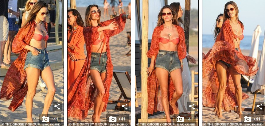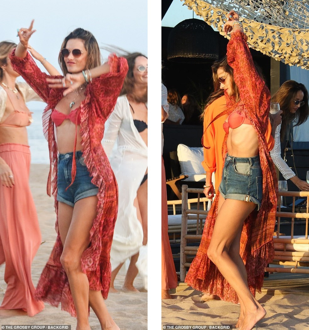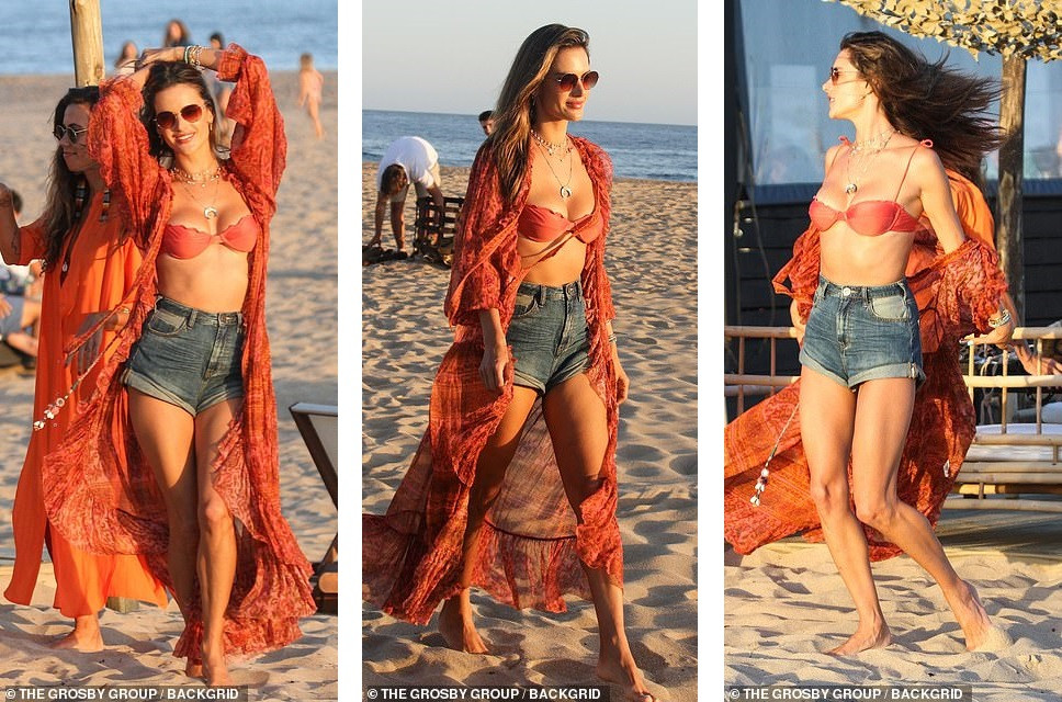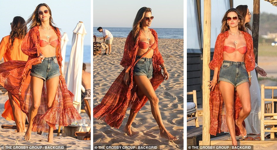 Tại đây, cựu "thiên thần" Victoria's Secret được nhìn thấy mặc áo bơi bé xíu, kết hợp với quần short jean và áo choàng voan màu đỏ cam nổi bật.