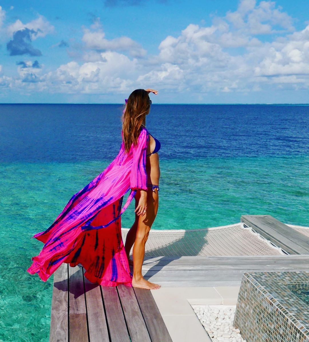 Mặc bikini nhỏ xíu, khoác áo choàng kaftan kiểu kimono loang màu thướt tha, Alessandra Ambrosio khoe dáng vóc quyến rũ như một tác phẩm nghệ thuật ở bãi biển thiên đường Maldives.