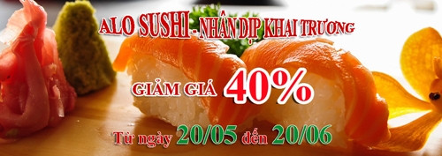 Nhân dịp khai trương, Alo Sushi xin gửi tới khách hàng chương trình khuyến mãi giảm giá lên tới 40% nhằm đáp ứng nhu cầu ẩm thực Nhật Bản của thực khách tại Hà Nội.