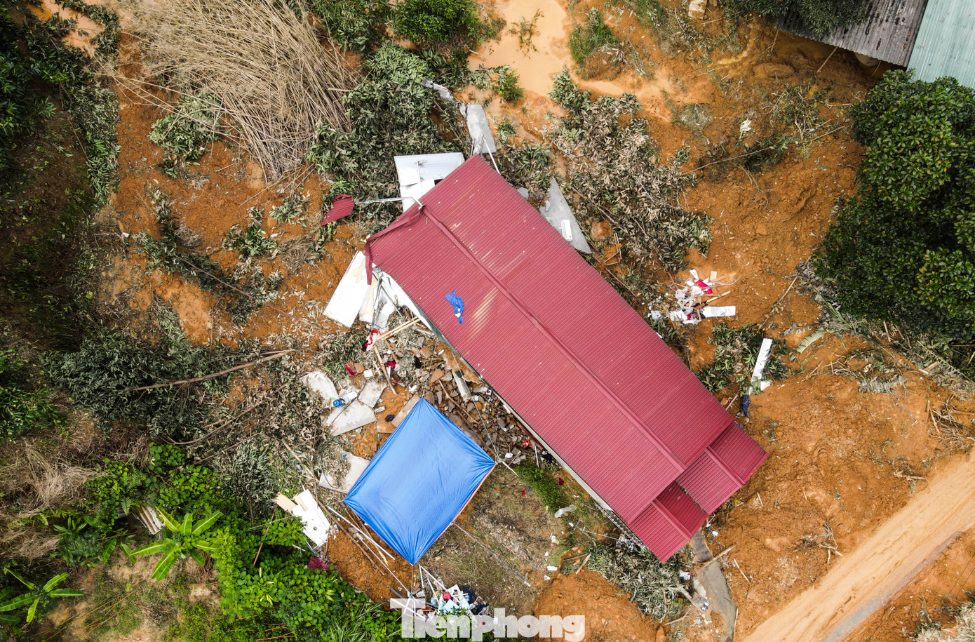 Vụ sạt lở đã vò nát cả mảng tường và các vật dụng bên trong. Trong làn nước mưa, lớp bùn dày chỉ còn những bộ quần áo bị bùn nhuốm màu, chiếc xe đồ chơi của trẻ em.