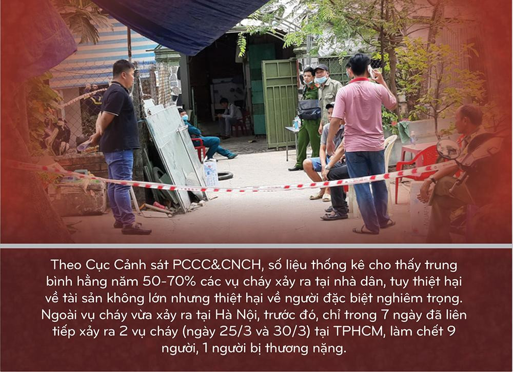 Cục Cảnh sát PCCC&CNCH cho biết, thiệt hại về người trong các vụ cháy nhà dân phần lớn là do lối thoát nạn thông thường chỉ có một, ở cửa đi hằng ngày của gia đình. Trong trường hợp xảy ra cháy, khói độc và lửa bịt kín lối đi, làm cho các thành viên trong gia đình không thể tự thoát ra ngoài. Thời điểm xảy ra cháy thường vào ban đêm, dễ gây thiệt hại về người do trong khi ngủ người dân đóng kín cửa phòng, khi cháy xảy ra không được phát hiện kịp thời. Tới khi lửa phát triển lớn, nạn nhân không thể tự dập tắt bằng phương tiện tại chỗ.