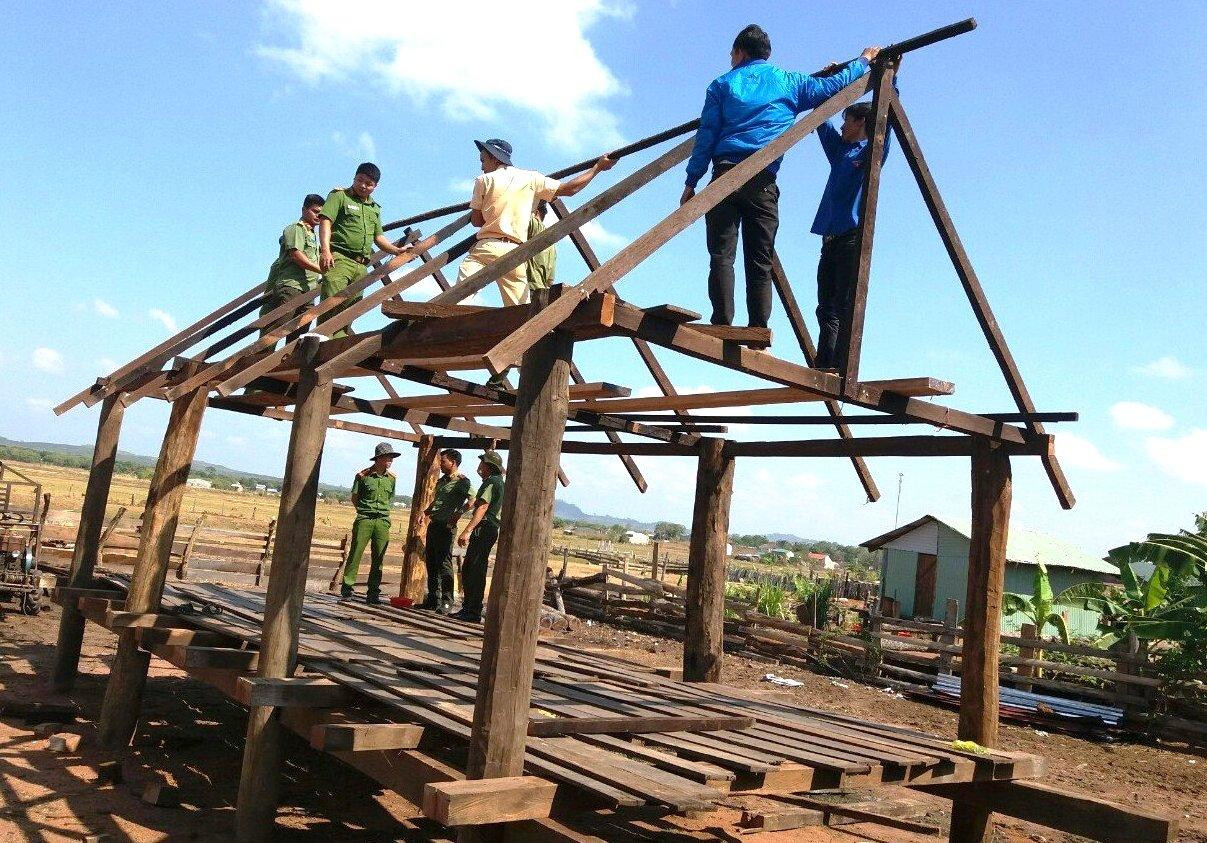 | Các chiến sỹ công an, thanh niên địa phương sửa chữa nhà giúp dân |