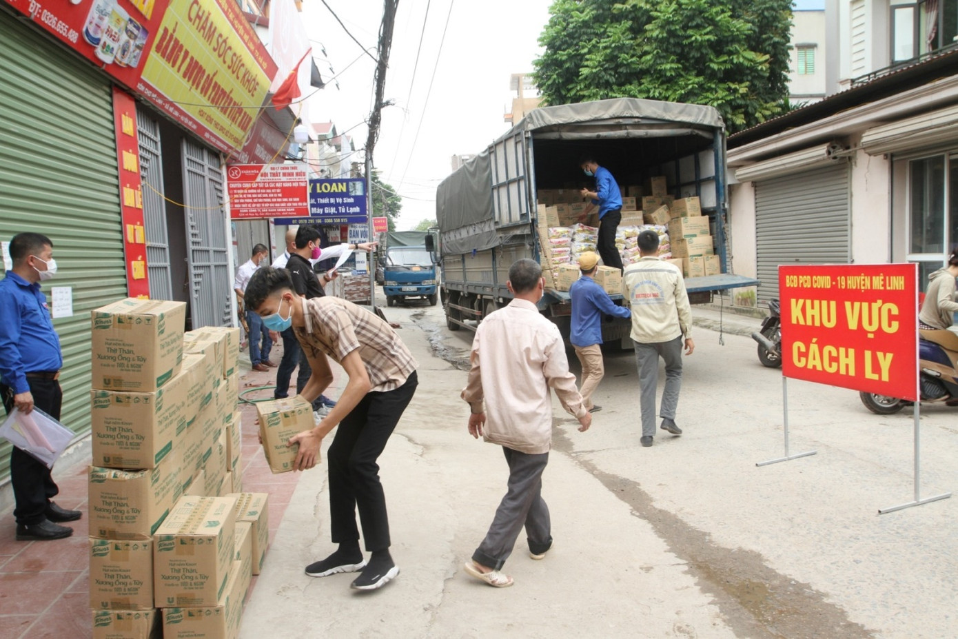 Xe hàng tài trợ sản phẩm đến thôn Hạ Lôi, Mê Linh, Hà Nội trong giai đoạn thực hiện cách ly. Nguồn hàng được Ban phòng chống COVID-19 sử dụng để đảm bảo vệ sinh trong xóm ngõ và từng gia đình, nơi có tổng số gần 11.000 nhân khẩu cách ly