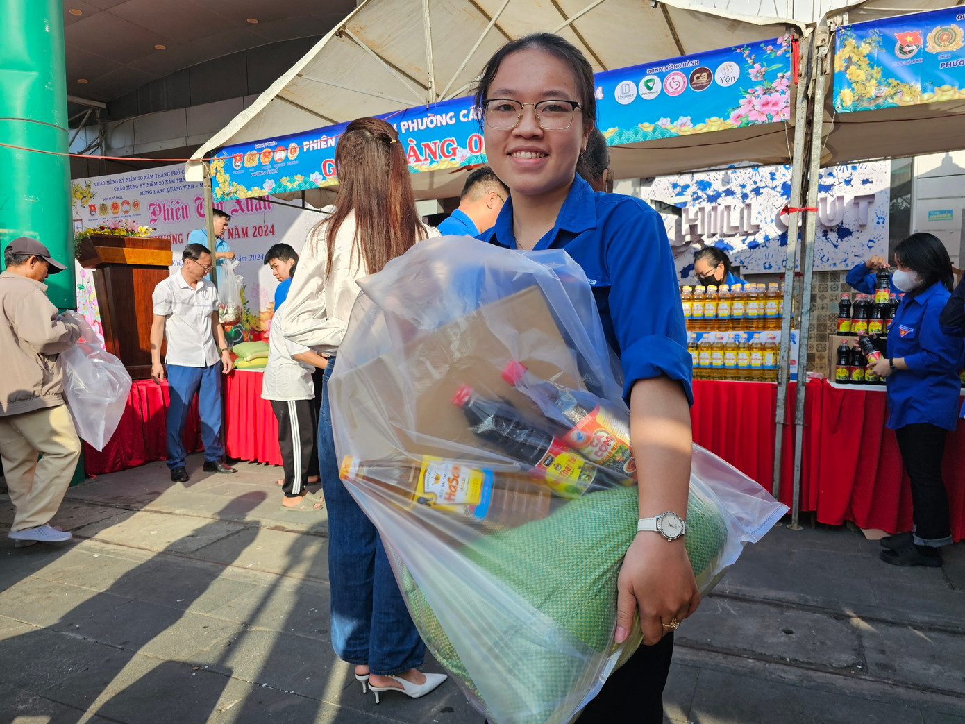 | Hoa khôi Sinh viên TP Cần Thơ 2024 Phan Lê Kim Ngọc hỗ trợ mang quà Tết ra xe cho người dân. Ảnh: Hòa Hội |