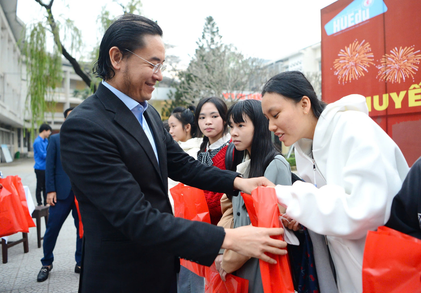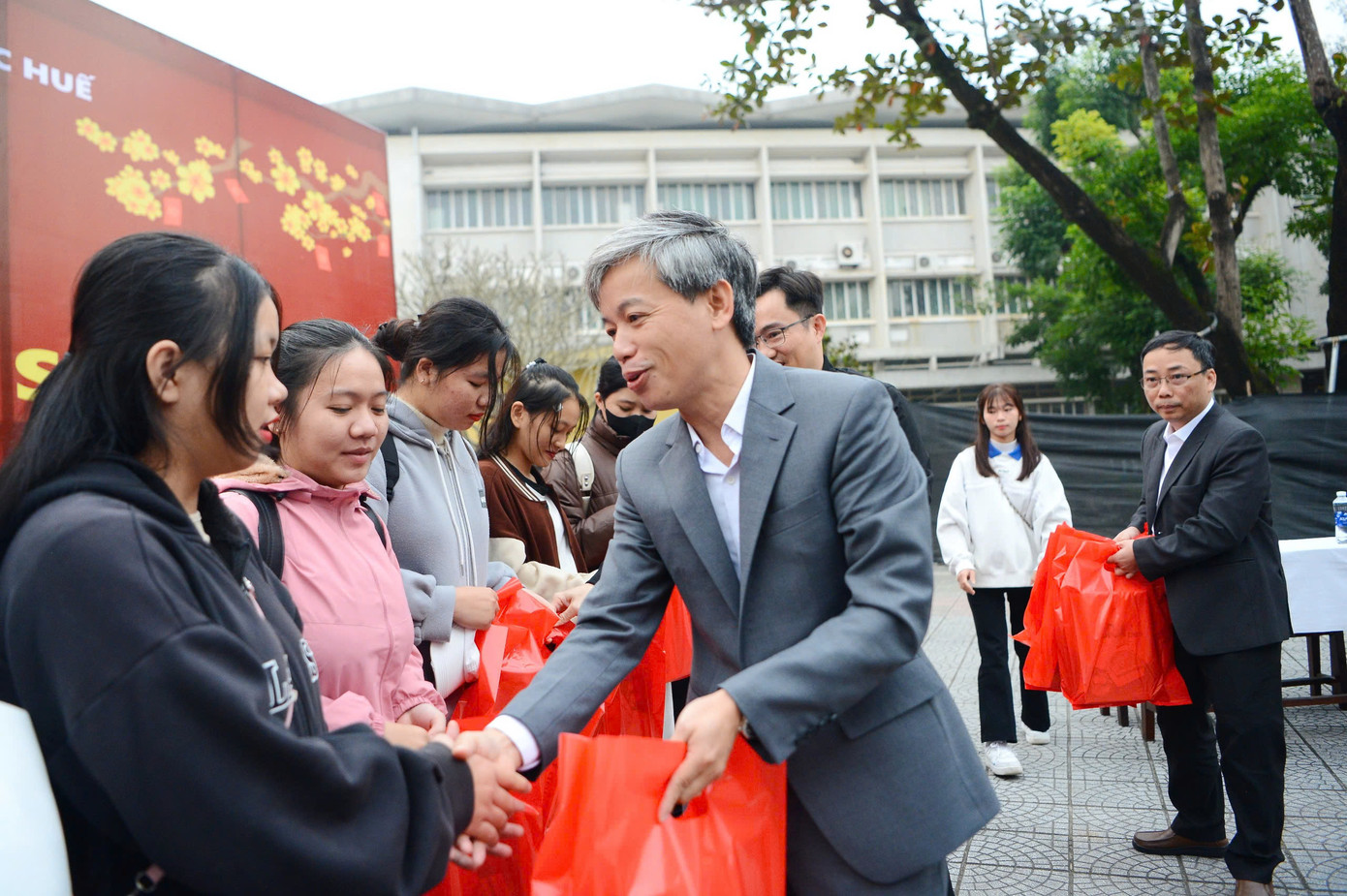 | Tiến sĩ Lê Hồ Sơn - Hiệu trưởng Trường ĐH Sư phạm Huế tặng quà Tết cho sinh viên trước khi về quê sum họp cùng gia đình. |