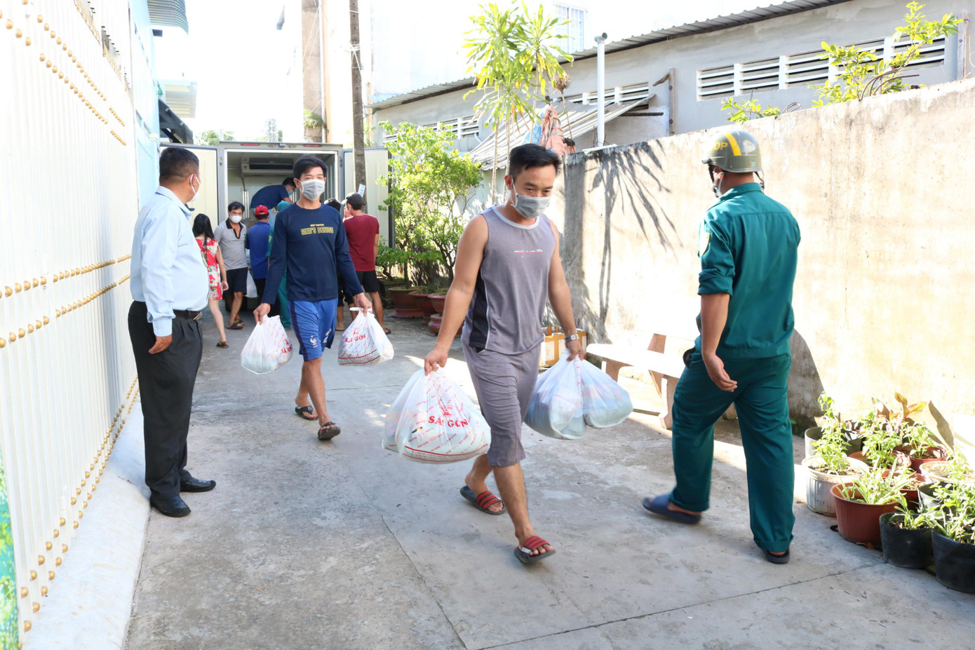 | Để chia sẻ khó khăn với lực lượng công nhân, UBND phường Trà Nóc đã vận động các nguồn kinh phí hơn 1,2 tỉ đồng để mua nhu yếu phẩm hỗ trợ bà con an tâm sinh sống trong mùa dịch. Đồng thời, vận động các chủ nhà trọ giảm bớt phần nào tiền thuê để nhẹ gánh nặng cho công nhân nghèo. Bên cạnh đó, nhiều nhà hảo tâm cũng mang đến những suất quà gồm gạo, mì, rau, nước tương, nước mắm,… tiếp sức với bà con - Ảnh: Kim Hà. |