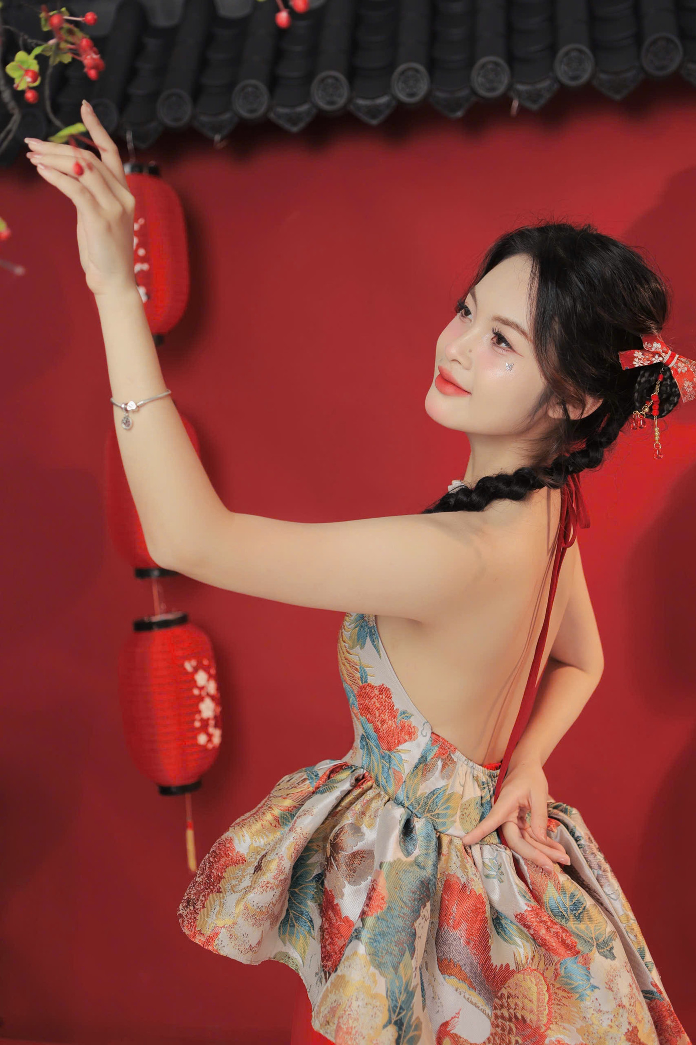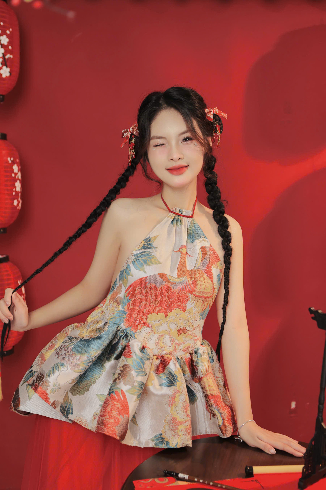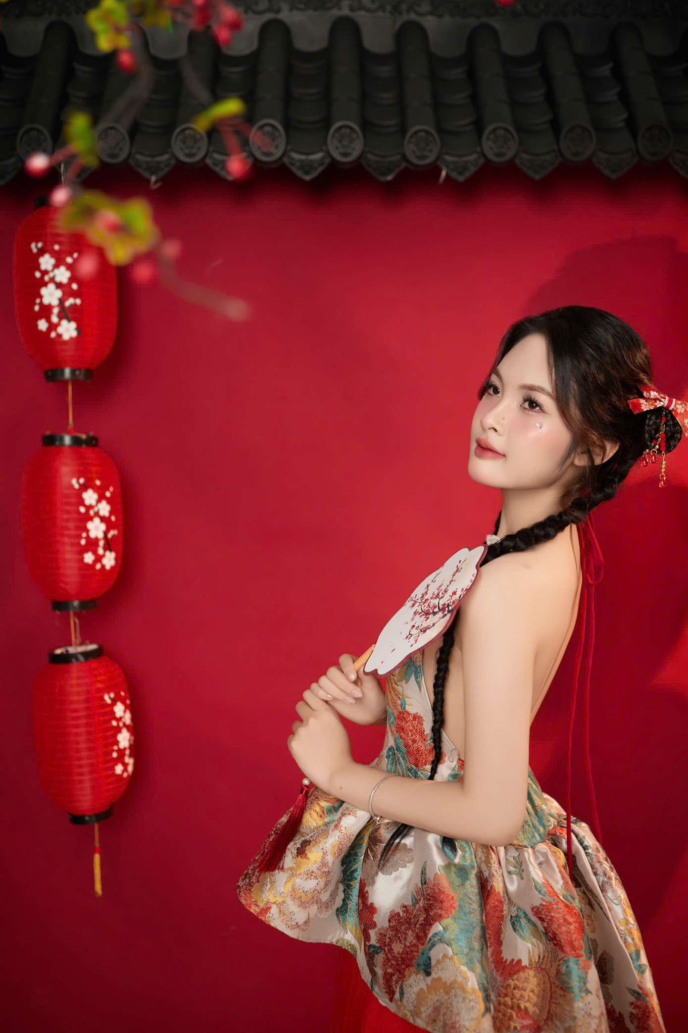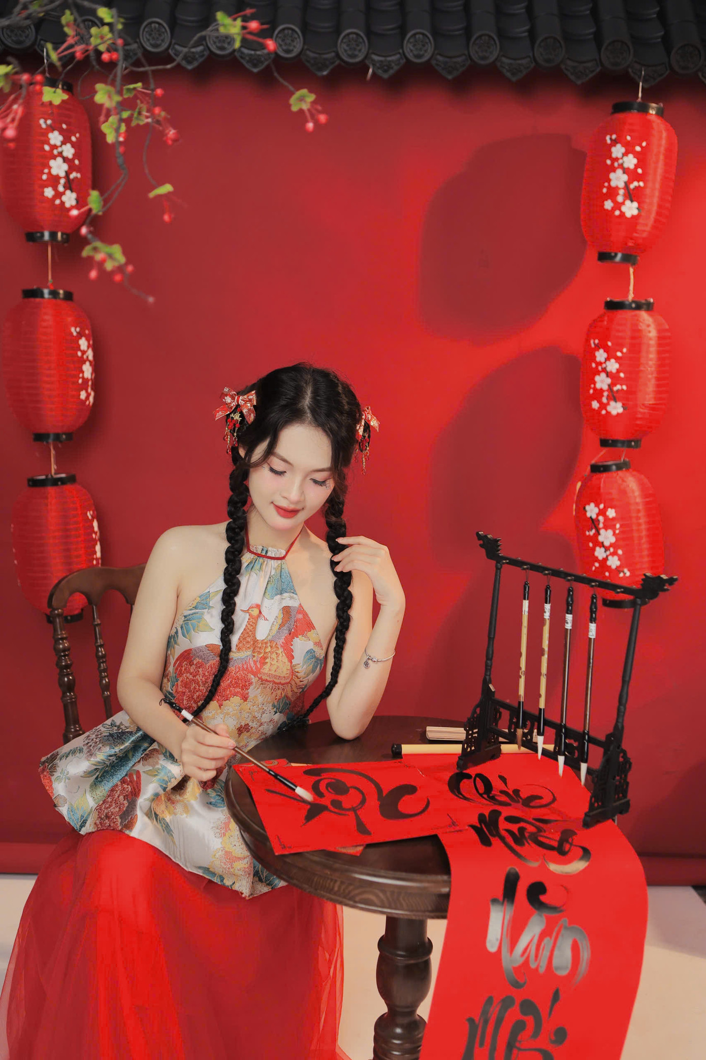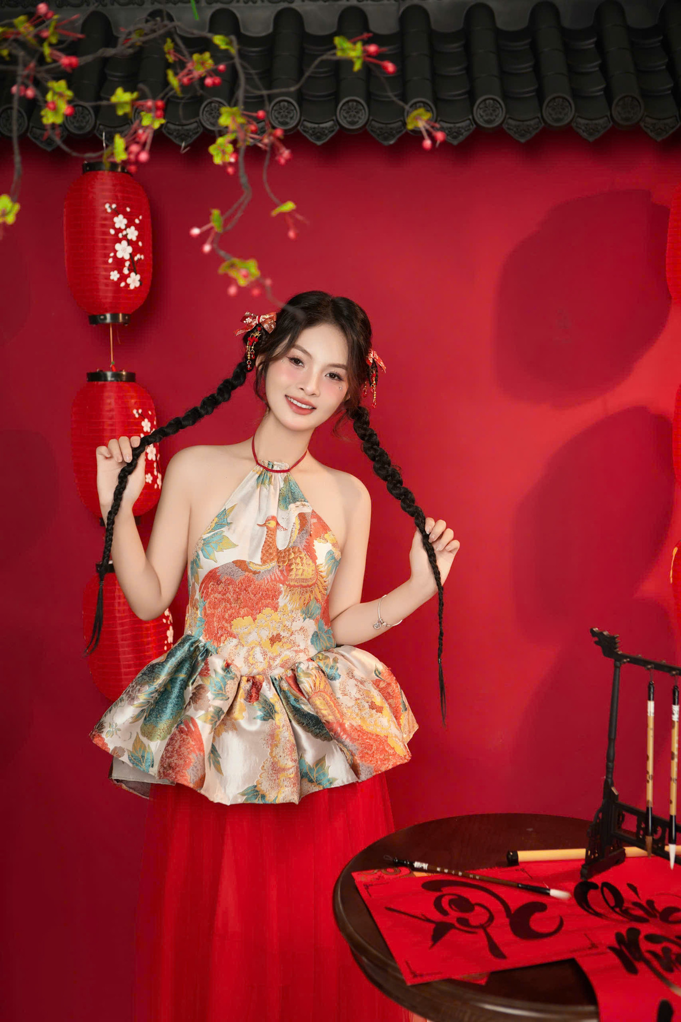 Áo yếm – một biểu tượng của người phụ nữ Việt Nam xưa, nhưng được cách tân để phù hợp với thị hiếu hiện đại. Concept này không chỉ giúp giữ gìn văn hóa truyền thống mà còn làm nổi bật vẻ đẹp tự nhiên và sự duyên dáng của người con gái Việt trong bối cảnh ngày Tết. Sự kết hợp hài hòa giữa đèn lồng, quạt giấy và thư pháp, tất cả được sắp đặt để vừa truyền tải sự quen thuộc của văn hóa Việt, vừa mang hơi thở tươi mới, sáng tạo.