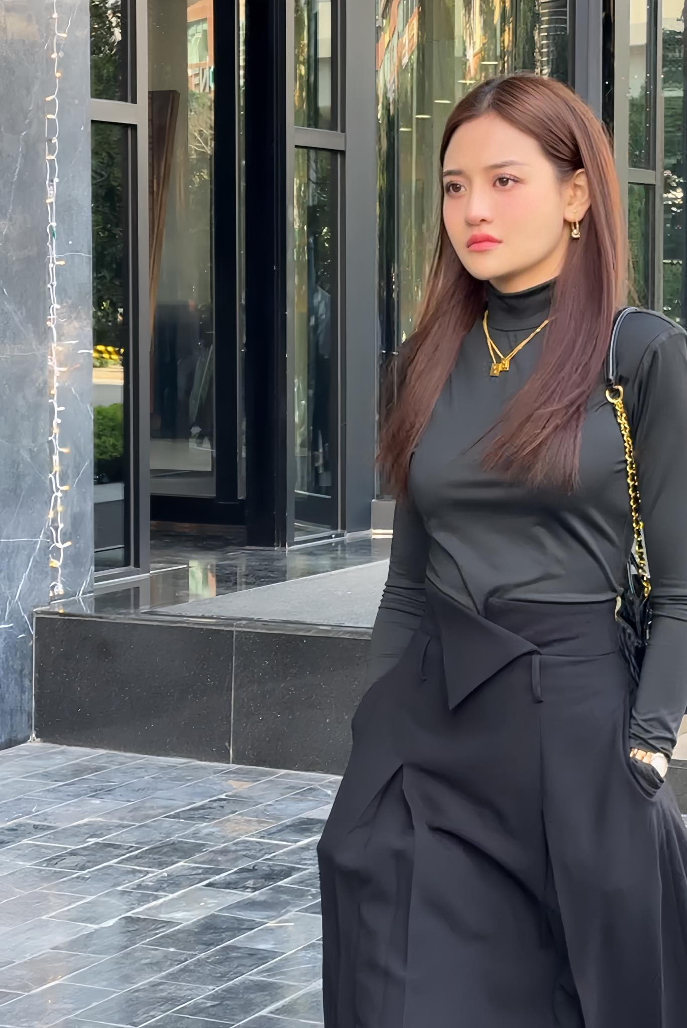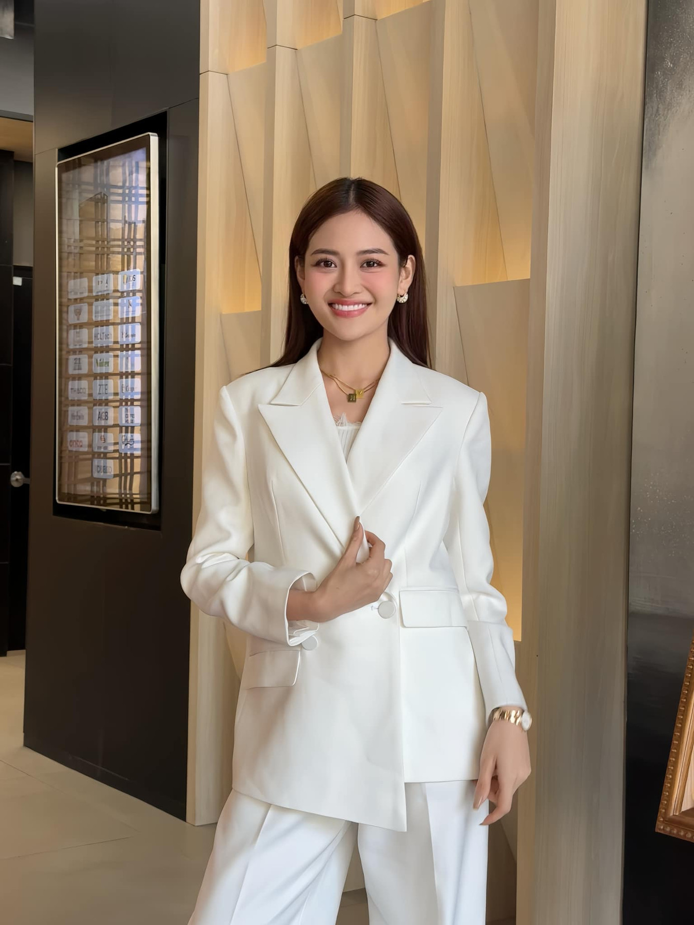 Ngay cả khi kết hợp quần tây đen với sơ mi trắng tưởng là công thức an toàn nhất, Như Ý cũng phải tạo điểm nhấn bằng khuy áo hình bông hoa trà, và cả vạt giả váy vòng quanh quần.