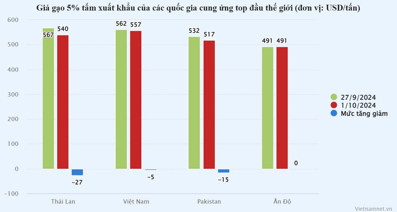 Đến ngày 1/10, giá gạo Thái Lan giảm mạnh còn 540 USD/tấn - mức thấp nhất trong vòng 14 tháng qua; gạo Pakistan cũng giảm còn 517 USD/tấn. Trong khi đó, gạo Việt Nam giảm nhẹ về mức 557 USD/tấn. Với mức giá ở thời điểm hiện tại, gạo Việt Nam vẫn đắt đỏ nhất trong top các quốc gia xuất khẩu lớn trên thế giới.