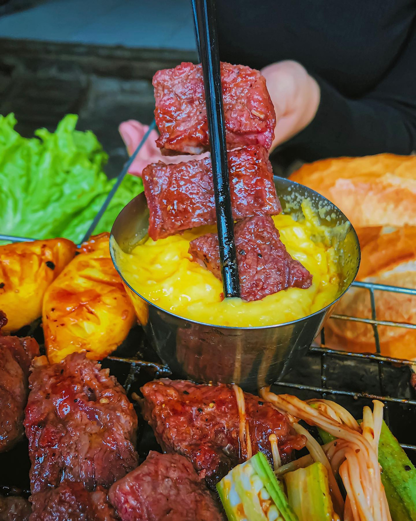 Thịt bò mọng nước, được nướng hoàn toàn trên lửa than nên ăn cảm giác ngon hơn hẳn. Một phần gồm 2 miếng bò không hề nhỏ, ăn kèm bánh mì nóng giòn nữa là chuẩn bài và bao no. Một phần bò sốt trứng muối, bạn được tặng kèm 2 ổ bánh mì và 1 dĩa xà lách nha!