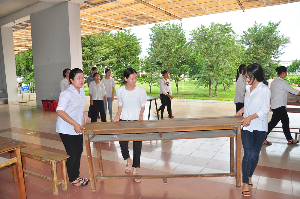 Sinh viên Trường Đại học An Giang hỗ trợ Ban tổ chức dọn dẹp vệ sinh hội trường trước ngày hội chính diễn ra sáng 31/12