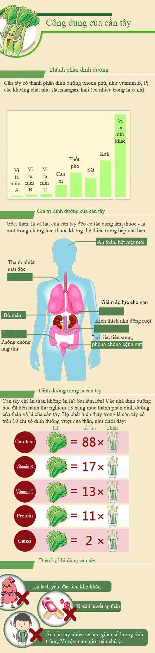 Cần tây có thành phần dinh dưỡng phong phú, như vitamin B, vitamin P, đặc biệt là các khoáng chất như sắt, mangan, kali trong lá. Nhưng nam giới ăn nhiều cần tây sẽ làm giảm số lượng tinh trùng.