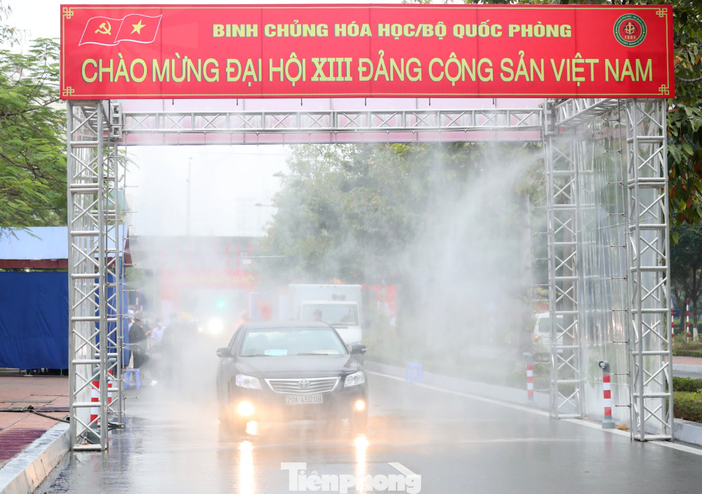 Phun thuốc khử khuẩn người và phương tiện ra vào Trung tâm Hội nghị quốc gia ngay từ những ngày đầu Đại hội.