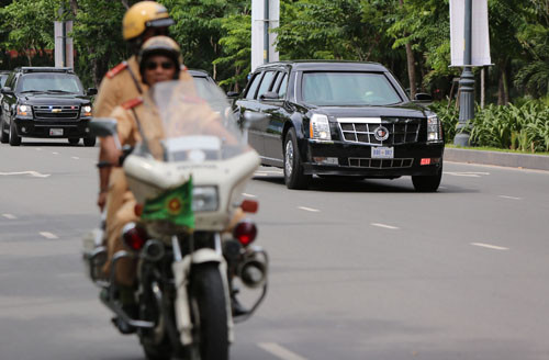 Các xế hộp 16 chỗ chở đoàn tùy tùng Mỹ cũng đậu dọc theo các khách sạn. Tại một khách sạn lớn trên đường Hai Bà Trưng, từ chiều qua, 2 xe tải có thùng màu trắng, mang biển số Mỹ vào cổng sau khách sạn này chuyển đồ. Hai xe thùng này được phi cơ Boeing C-17 Globemaster III mang biệt danh "Ngựa thồ" chở xuống sân bay Tân Sơn Nhất và nằm trong đoàn xe phục vụ tổng thống Barack Obama.