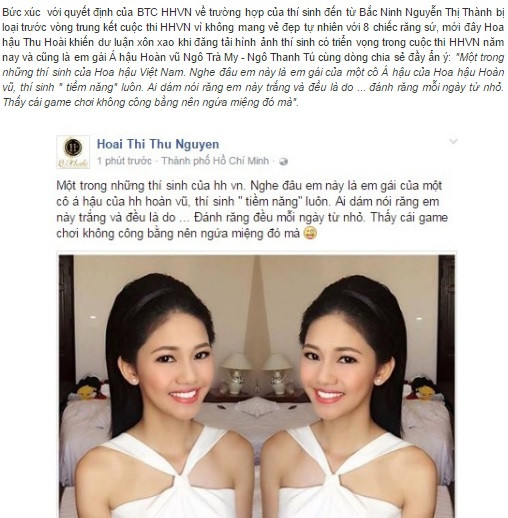 Bài báo và facebook ghi dòng stt hoang báo kia cũng dẫn đến vài bài khác, kiểu Hoa hậu Thu Hoài bênh vực Nguyễn Thị Thành, tố BTC HHVN thiếu công bằng. Trên đó chủ trang viết “Một cô gái không bè phái, không tiền bạc, không chỗ dựa kinh khủng nào phía sau, chỉ có mỗi niềm tin và khát vọng đơn thuần thì sao có thể làm nên chuyện tại cuộc thi này?”.