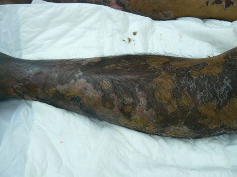 Bệnh nhân bị liên cầu khuẩn lợn, dẫn tới nhiễm trùng huyết suy đa tạng, có nhiều ban hoại tử đen toàn thân, đặc biệt là ở mặt.