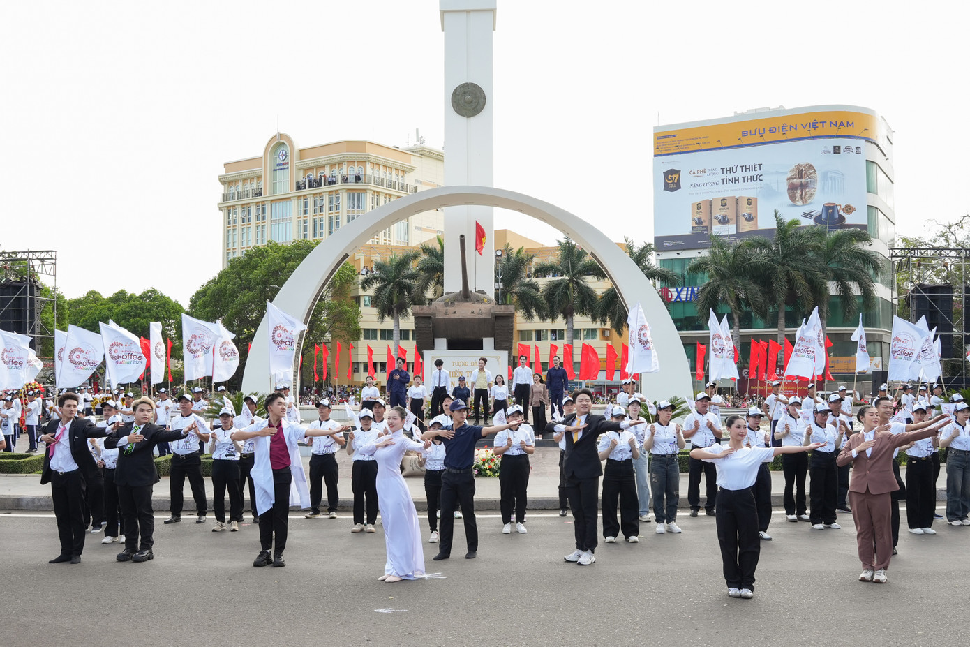 Tại đây, tổ khúc nghệ thuật “Buôn Ma Thuột – Huyền thoại tháng Ba” được trình diễn, hòa cùng hình ảnh cờ đỏ sao vàng tung bay, khắc họa sâu sắc tinh thần quật cường và niềm tự hào dân tộc. Khoảnh khắc đầy xúc động này hòa cùng hình ảnh hàng trăm học sinh sinh viên với những cành hoa cà phê trắng muốt và trái chín đỏ không chỉ gợi nhắc một chặng đường lịch sử hào hùng mà còn thể hiện khát vọng của một thủ phủ cà phê thế giới vươn xa trên bản đồ thế giới.