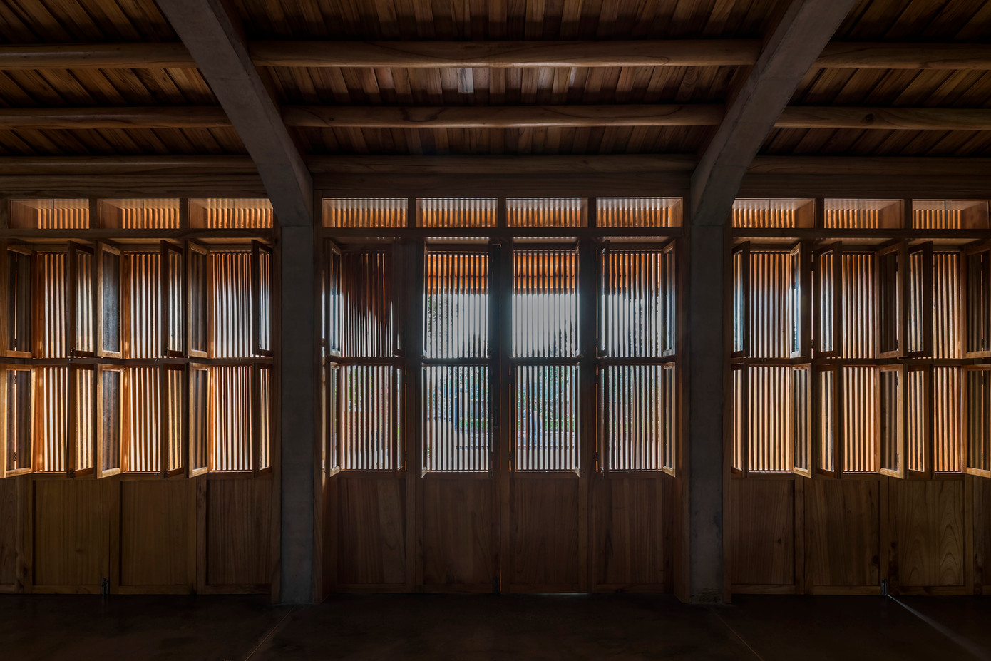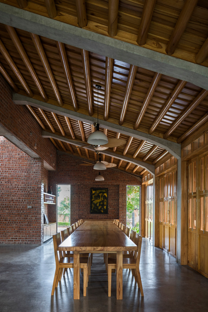 Để tạo không gian lớn, phần mái sử dụng hệ kết cấu kết hợp với bê tông giúp tiết kiệm chi phí và không phải sử dụng những cây gỗ quá lớn, quá dài và khó tìm. Toàn bộ đồ dùng và hệ cửa trong nhà cũng được sử dụng gỗ xoan.