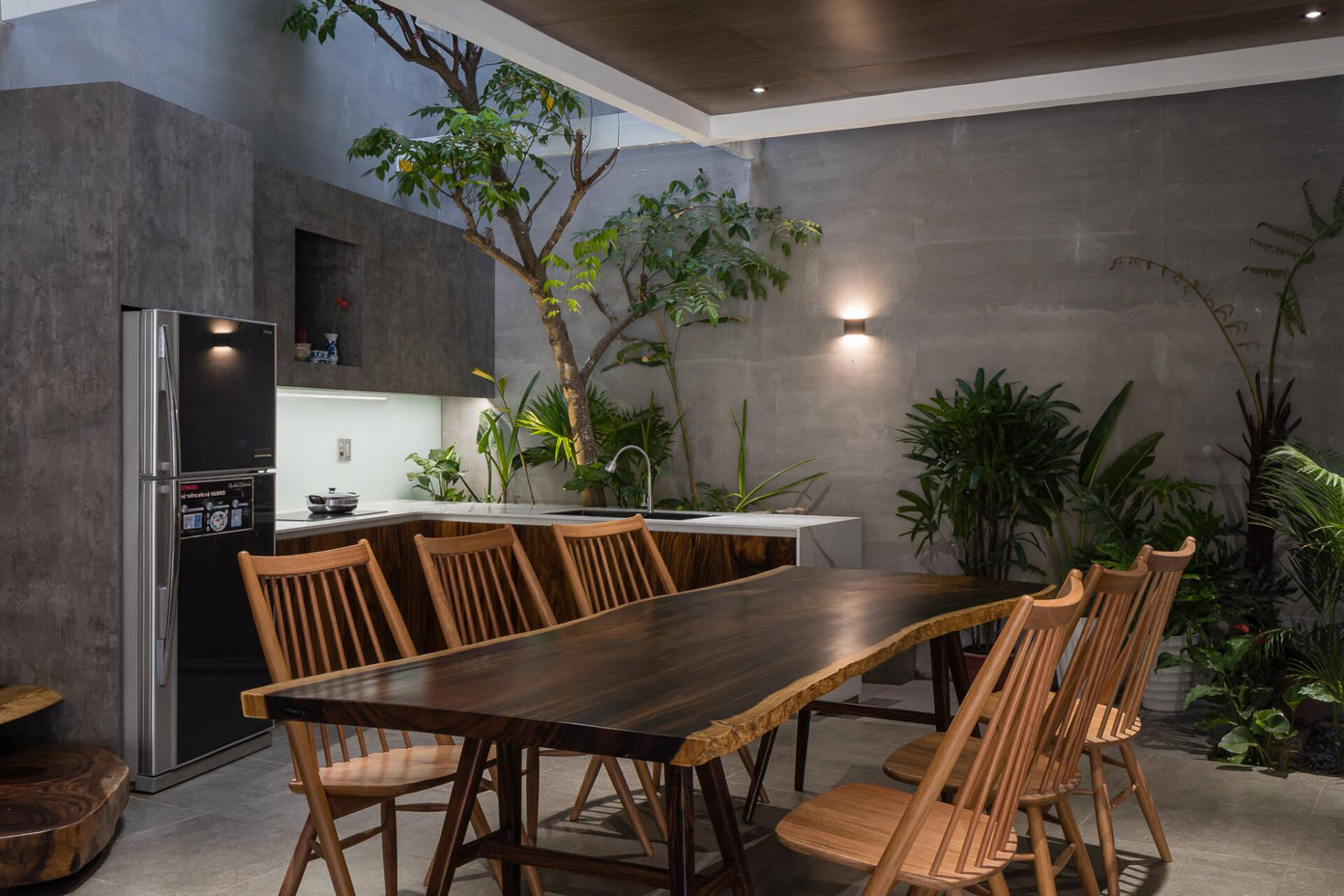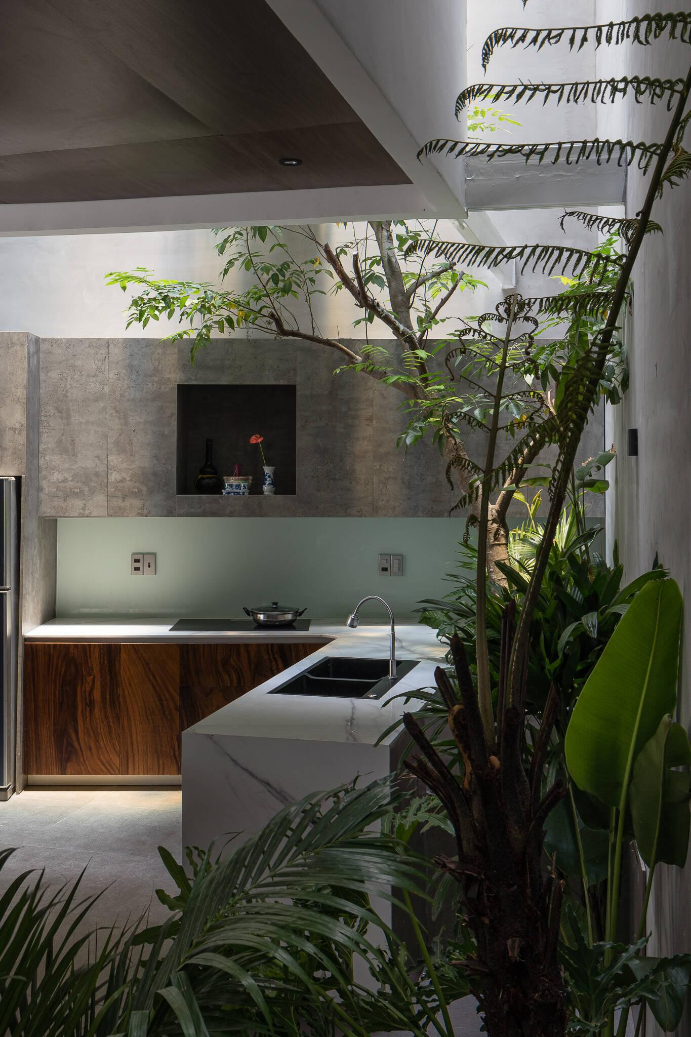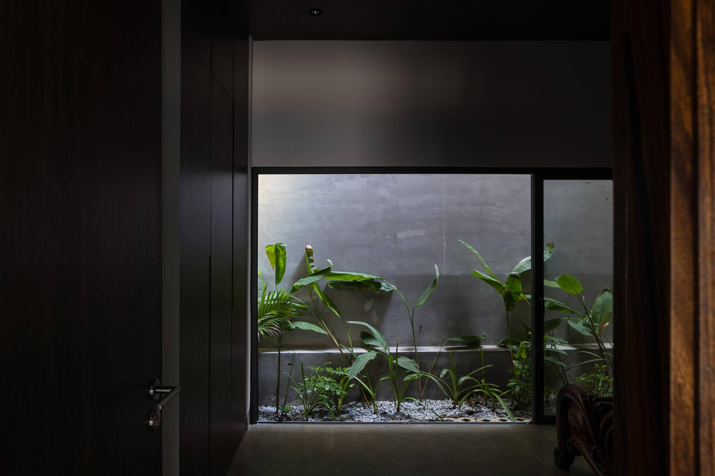 | Phòng khách có tầm nhìn ra giếng trời và nhiều cây xanh thoáng đãng. |