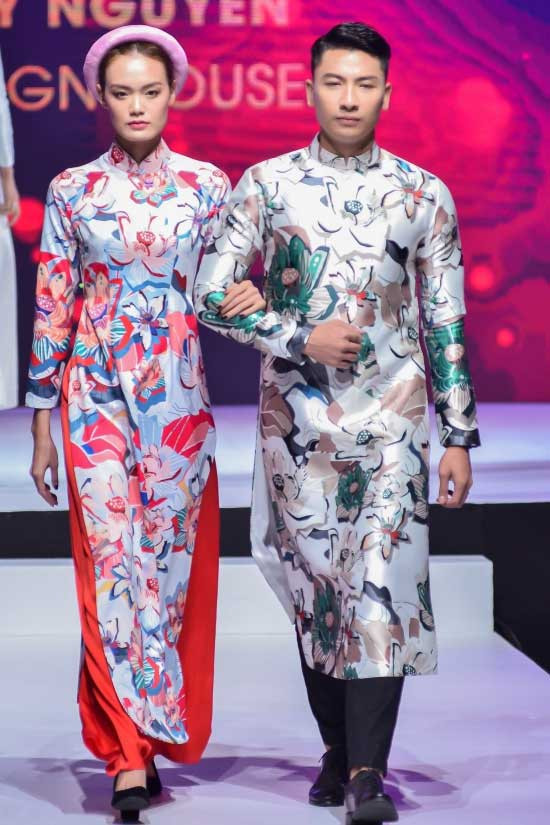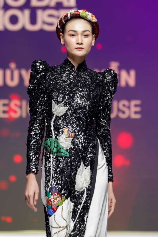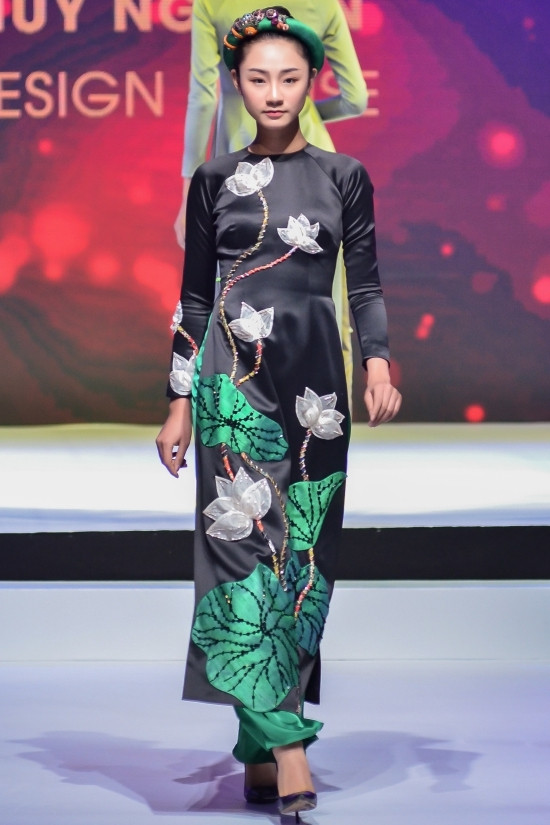 Các thiết kế áo dài của Thủy Nguyễn được biến tấu với hình ảnh hoa sen qua nhiều phom dáng, chất liệu. Trong ảnh: hoa sen được đính kết kim sa bằng tay trên thân áo.
