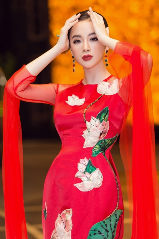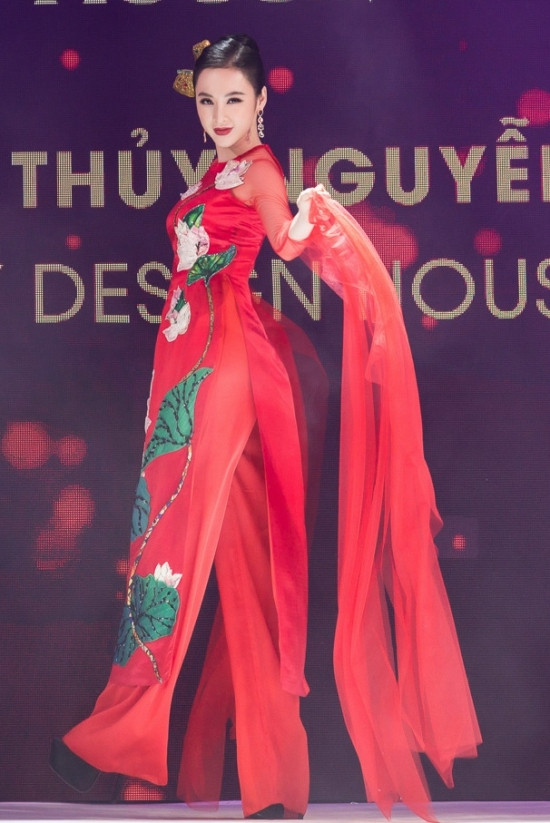 Angela Phương Trinh trình diễn vũ đạo uyển chuyển với dài lụa đỏ được may liền phần tay áo.