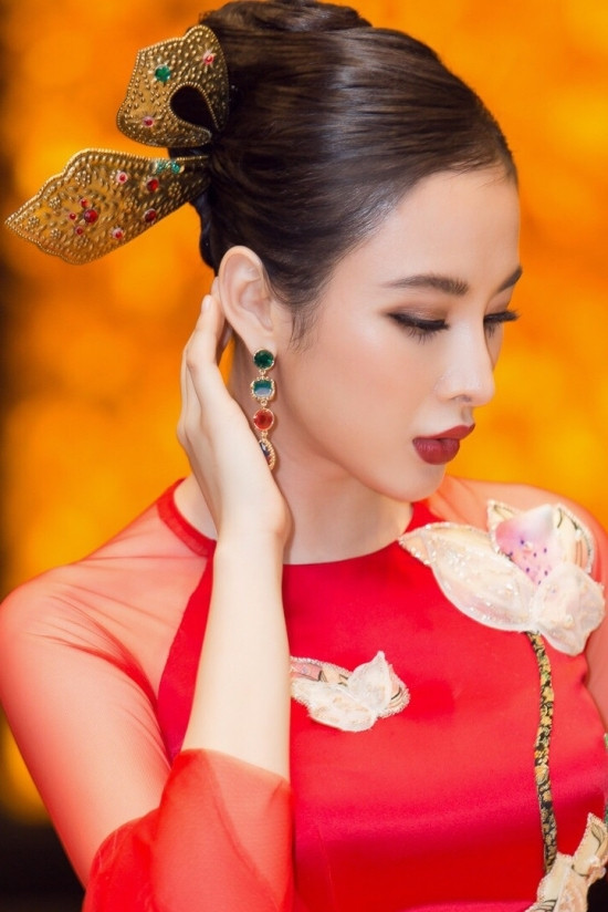 Người đẹp trang điểm theo tông màu trầm, nhấn vào đôi môi. Mái tóc Phương Trinh được bới theo phong cách cổ điển với trâm cài đính đá.