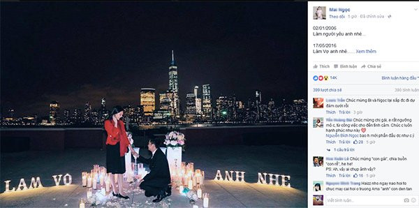 Theo đó, trong khung cảnh lãng mạn ở thành phố New York (Mỹ), bạn trai Mai Ngọc đã quỳ xuống cầu hôn cô với dòng chữ "Làm vợ anh nhé" bên những ánh nến lung linh và hoa hồng khiến ai cũng xuýt xoa. Bên cạnh đó, nữ MC 9X chia sẻ, cô và bạn trai đã có thời gian 10 năm yêu nhau.