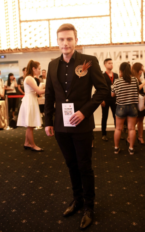 Kyo York tạo điểm nhấn cho bộ vest bằng cài áo độc đáo.