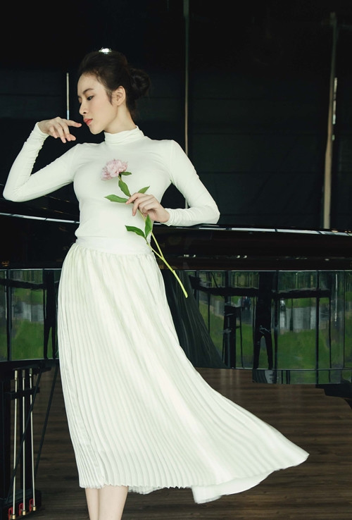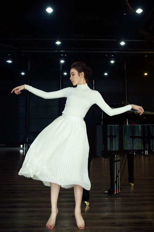 Với bối cảnh sàn tập ballet, nữ diễn viên 20 tuổi hóa thân thành một vũ công xinh đẹp và cô đơn. "Bà mẹ nhí" thể hiện những động tác uyển chuyển của bộ môn nghệ thuật.