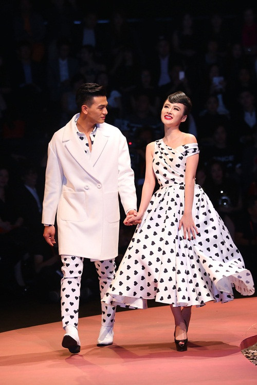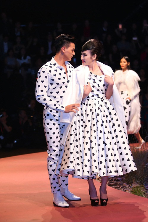 Cả hai đều diện thiết kế họa tiết trái tim với tông màu trắng đen. Thiết kế đầm bồng bềnh cùng chi tiết lệch vai bất đối xứng khiến Angela Phương Trinh toát lên vẻ gợi cảm.