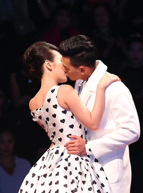 Lần khóa môi thứ hai của cặp người mẫu lại làm người xem reo hò trong phấn khích. Lần này, với nụ hôn dễ thương của Angela Phương Trinh, Lê Xuân Tiền nhẹ nhàng cởi áo khoác...