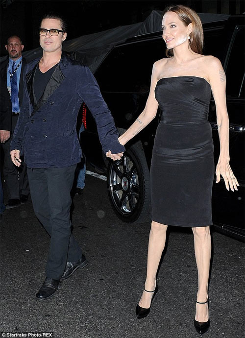 Nữ minh tinh nổi tiếng mắc lỗi lạm dụng phấn highlight. Nhưng, dường như Angelina Jolie không hề hay biết gì về điều này. Cô vẫn nở nụ cười tươi tắn khi sánh đôi bên Brad Pitt.
