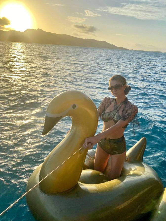Mỹ nhân 39 tuổi diện bikini tạo dáng trên phao thiên nga khổng lồ.