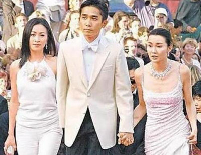 Lương Triều Vỹ nắm tay bạn gái Lưu Gia Linh (trái) và người tình tin đồn Trương Mạn Ngọc, trên thảm đỏ Liên hoan phim Cannes 2000. Đôi bạn diễn ăn ý Triều Vỹ - Mạn Ngọc tham gia LHP với tư cách là diễn viên Tâm trạng khi yêu còn Gia Linh được cho là đi theo để "quản lý" bạn trai trước tình địch.