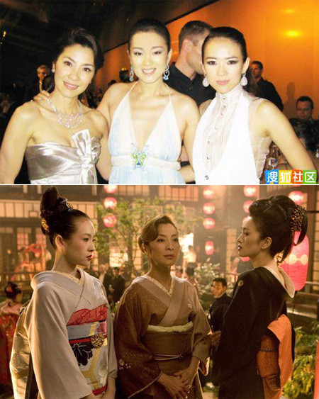 Ảnh trên, từ trái sang Dương Tử Quỳnh, Củng Lợi, Chương Tử Di - ba nữ diễn viên gốc Hoa khẳng định được tên tuổi trong làng điện ảnh thế giới. Ảnh dưới, hình ảnh họ (từ trái sang: Chương Tử Di, Dương Tử Quỳnh, Củng Lợi) trong phim Hồi ức của một geisha.