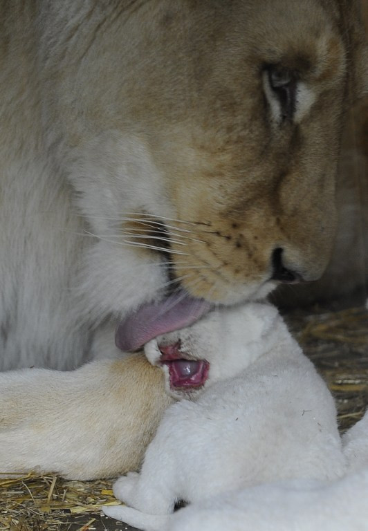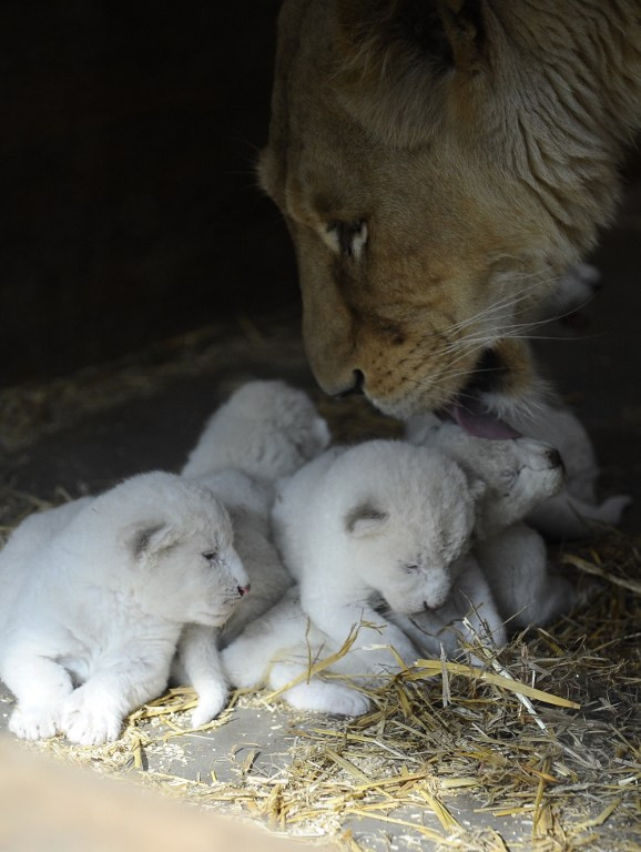 TPO - Năm chú sư tử con màu trắng quý hiếm vừa được sinh ra tại Công viên Động vật học Amnéville, Moselle (Pháp) hôm 17/4/2015.
