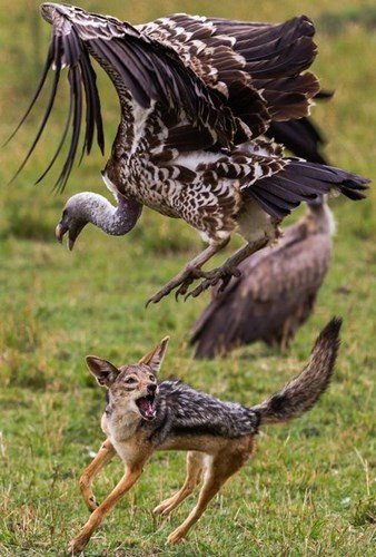 Trong bức ảnh này, kền kền đang thủ thế, đề phòng chó sói cướp mất thức ăn của mình.