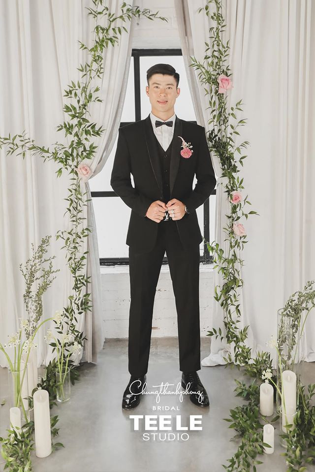 Chàng cầu thủ quê Đông Anh bảnh bao điển trai trong bộ vest đen lịch lãm.