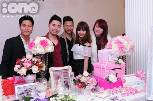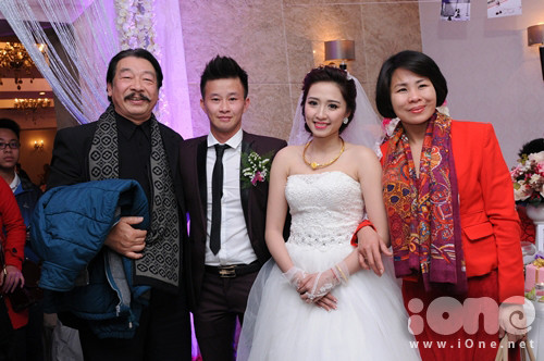 Hot girl wushu Mai Phương (áo trắng thứ hai từ phải sang), VĐV wushu Đức Cường (áo nâu) và VĐV cầu lông quốc gia Bùi Bằng Đức (áo đỏ) là những người bạn thân thiết của cô dâu chú rể.