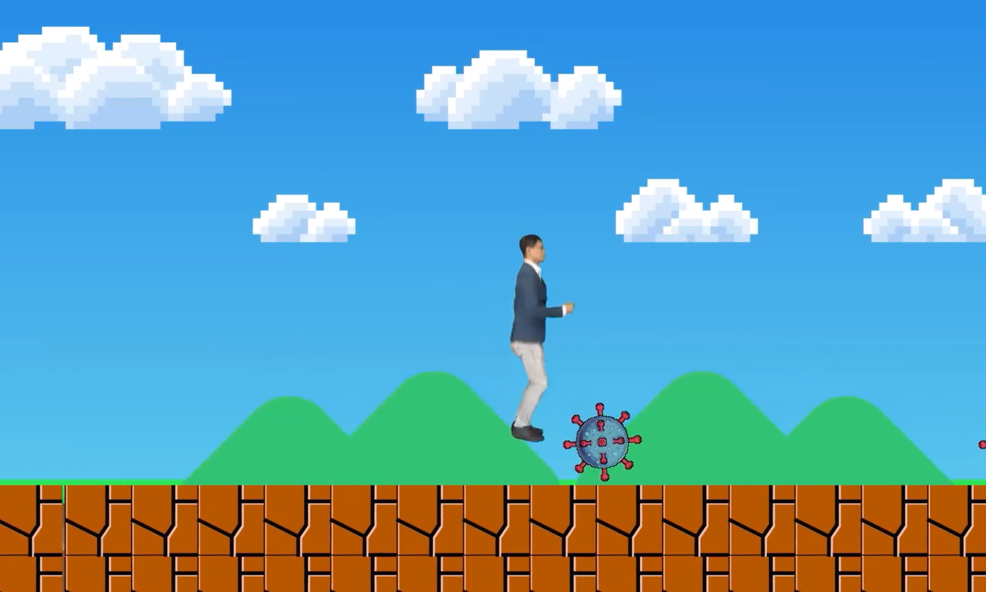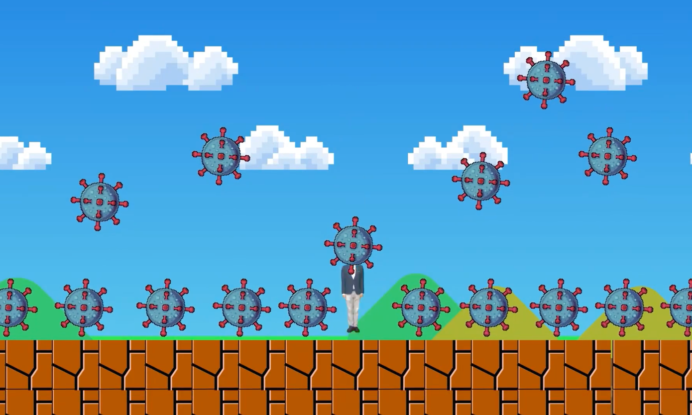 Cụ thể, "Mario" Việt Hoàng di chuyển để "thu nạp vật phẩm" là 2 mũi vắc-xin ngừa COVID-19, trên quãng đường đi thỉnh thoảng có gặp "quái vật" chính là virus SARS-CoV-2 nhưng anh vẫn "nhảy qua" một cách dễ dàng.