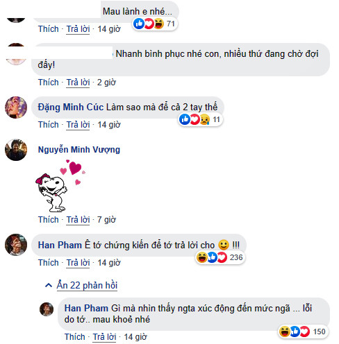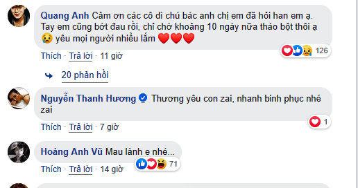 Bên dưới bài viết của Quang Anh, nhiều nghệ sĩ, diễn viên trong đoàn phim “Về nhà đi con” như Tuấn Tú, Minh Cúc, Hoàng Anh Dũng,…và nhiều người hâm mộ đã gửi lời hỏi thăm đến nam diễn viên và chúc anh mau chóng bình phục.