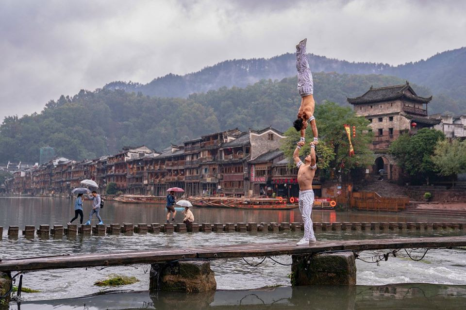 Trên một chiếc cầu gỗ chông chênh giữa hồ, hai anh em nhà họ Giang đã thực hiện các màn trình diễn các động tác khó, đòi hỏi kỹ thuật thăng bằng rất cao như chồng đầu, kéo đối kháng, giữ thăng bằng và với Quốc Nghiệp trên đầu, Quốc Cơ đã đi hết chiều dài của cây cầu gỗ giữa lòng Phượng Hoàng Cổ Trấn.