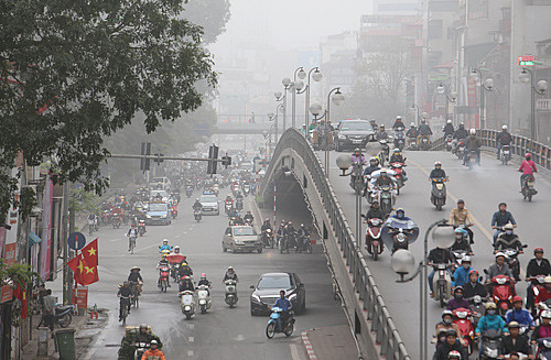 Tầm nhìn hạn chế, các cây cầu vượt cho người đi bộ trở nên xa mờ đối với người đi dưới đường. Ảnh: Dân Trí