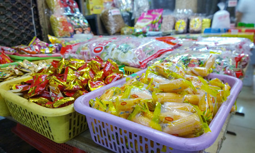 Bánh kẹo cân bày bán nhiều, không niêm yết giá bán...