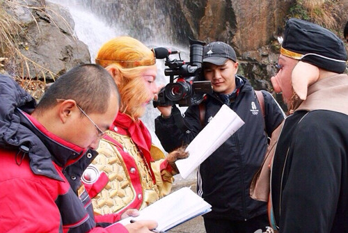 Đạo diễn Dương Khiết (áo khoác đen) hướng dẫn Mã Đức Hoa trong cảnh phân biệt Ngộ Không thật, giả.