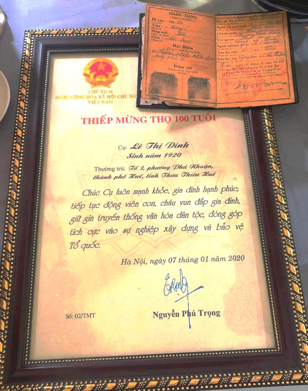 Sống thọ ngưỡng 100 tuổi, bà Lê Thị Dinh từng được Tổng Bí thư, Chủ tịch nước Nguyễn Phú Trọng gửi thiếp mừng thọ 100 tuổi.