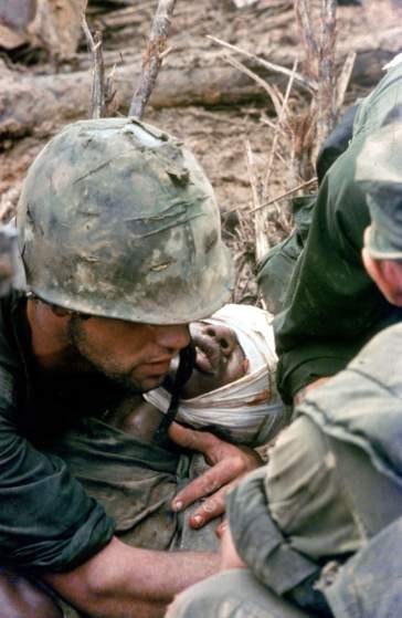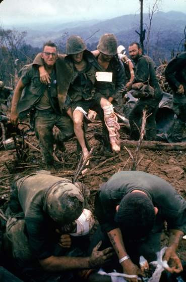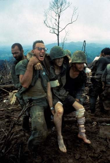 Jeremiah Purdie, một sĩ quan Thủy quân Lục chiến Mỹ, được quấn băng trắng ở đầu, đi về phía đồng đội bị thương sau trận giao tranh ở khu vực phi quân sự vào tháng 10/1966. Phóng viên ảnh Larry Burrows đã không ngại nguy hiểm khi theo sát đoàn lính Mỹ nhằm ghi lại những hình ảnh chân thực nhất. Ron Cook là người lính quân y ở góc trái tấm hình. "Đó không chỉ là một bức ảnh", ông Cook nói trên tờ Enquirer. Khi ra chiến trường, ông Cook mới 19 tuổi. "Cấp trên giao cho tôi nhiệm vụ phải chăm sóc cho 56 binh sĩ. Nếu có người qua đời, bạn phải ghi lại tên tuổi của họ và gửi về quê hương. Đó là nhiệm vụ quá lớn lao đối với những thanh niên mới lớn như chúng tôi".