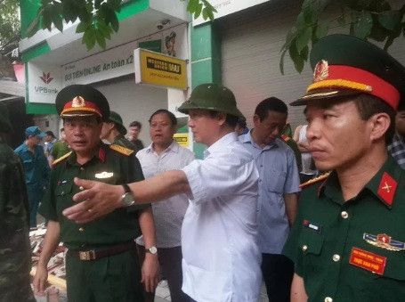 Phó Chủ tịch UBND TP Hà Nội Nguyễn Thế Hùng (giữa) tại hiện trường vụ sập nhà. Ảnh: Dân Trí.